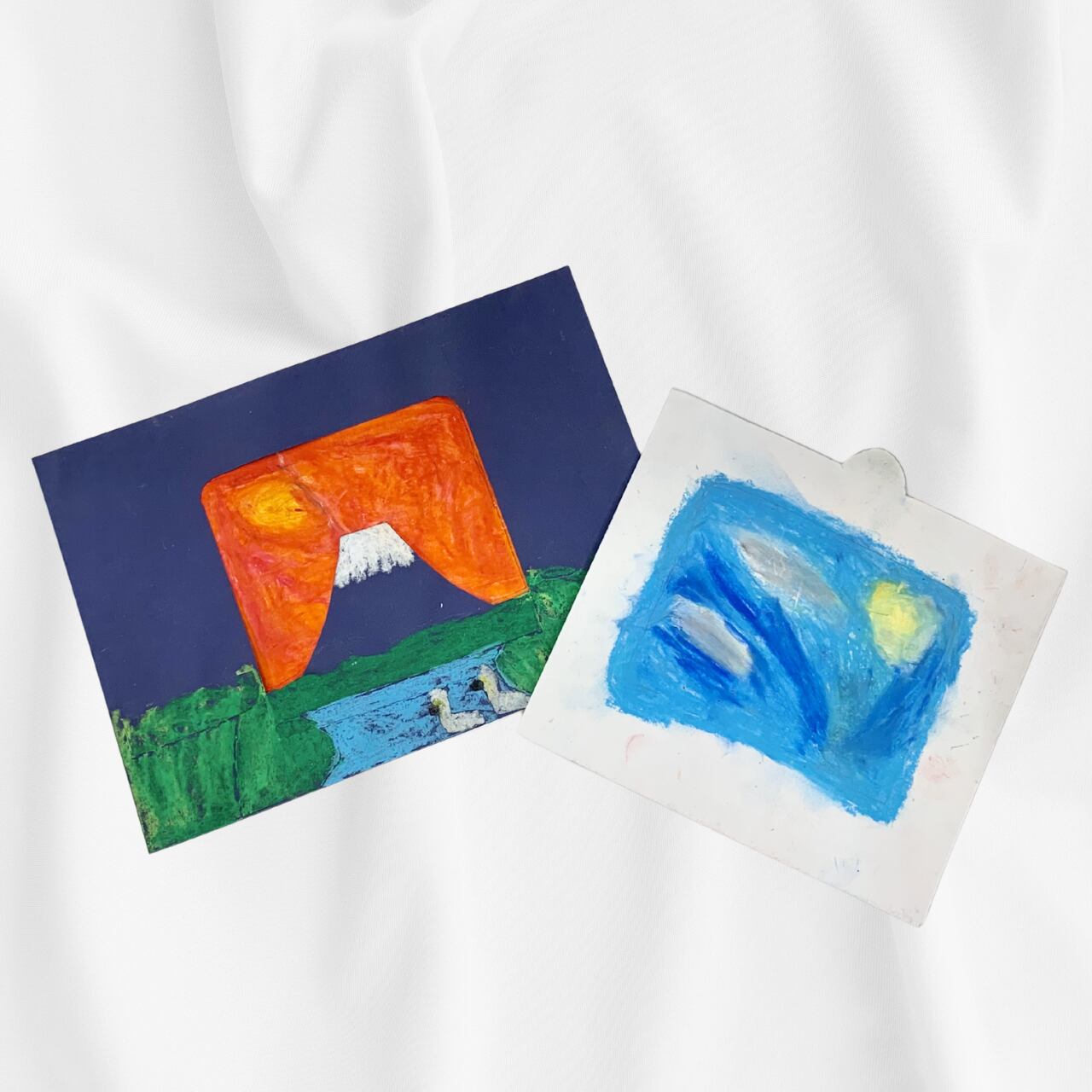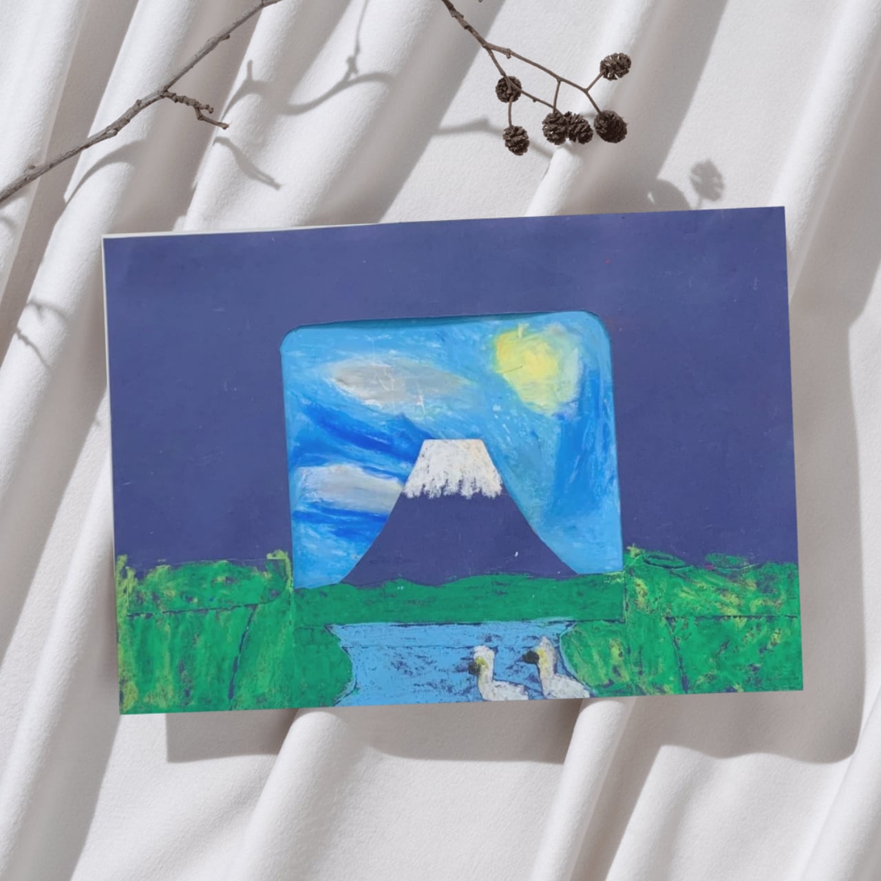 画用紙をスライドさせると、静かな夜の風景が鮮やかな日の出の風景へと変化する、仕掛け付きの絵画作品です。星が瞬く夜空から、朝焼けに染まる空へ。その移り変わりの瞬間を手で操作して楽しめる、見て・触れて・体験できる一点物のアートです。飾るだけでなく、何度でも夜明けの瞬間を楽しめる遊び心溢れる作品です。