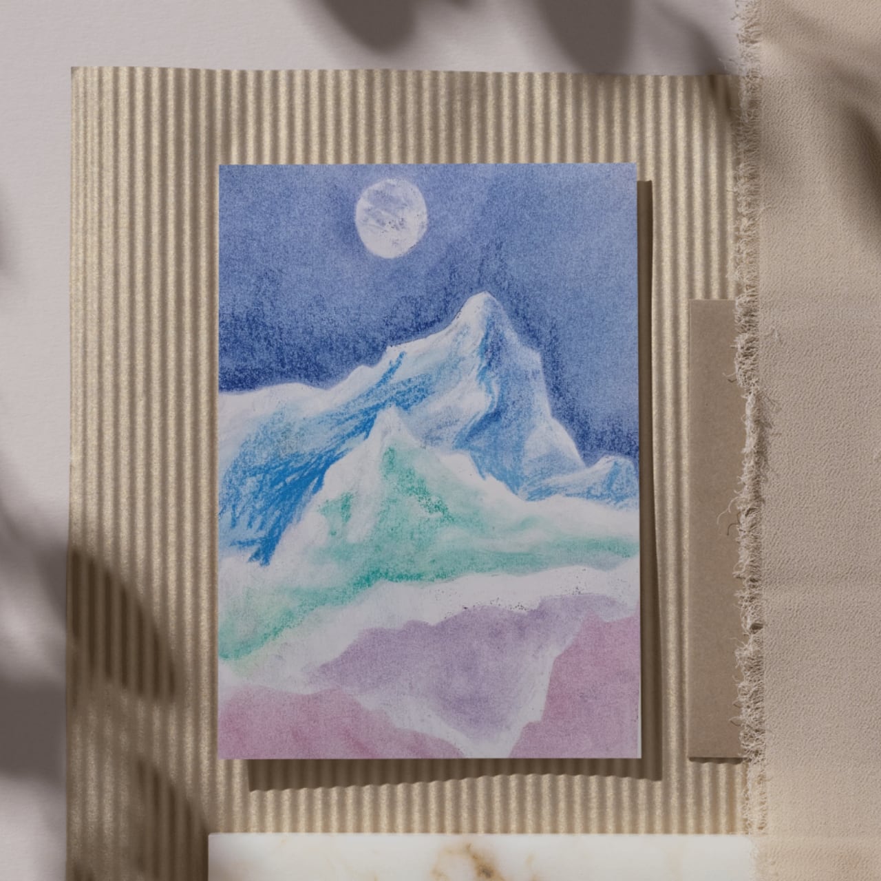 静寂に包まれた夜の雪山を、パステル特有の柔らかな発色と温かみのある質感で表現した作品です。深く濃い夜空と、月明かりに照らされて白く浮かび上がる雪山のコントラストが幻想的な雰囲気を醸し出しています。指でぼかしたパステルならではの柔らかな表現が、夜の静けさと雪山の神秘的な美しさを繊細に描き出した一点物です。