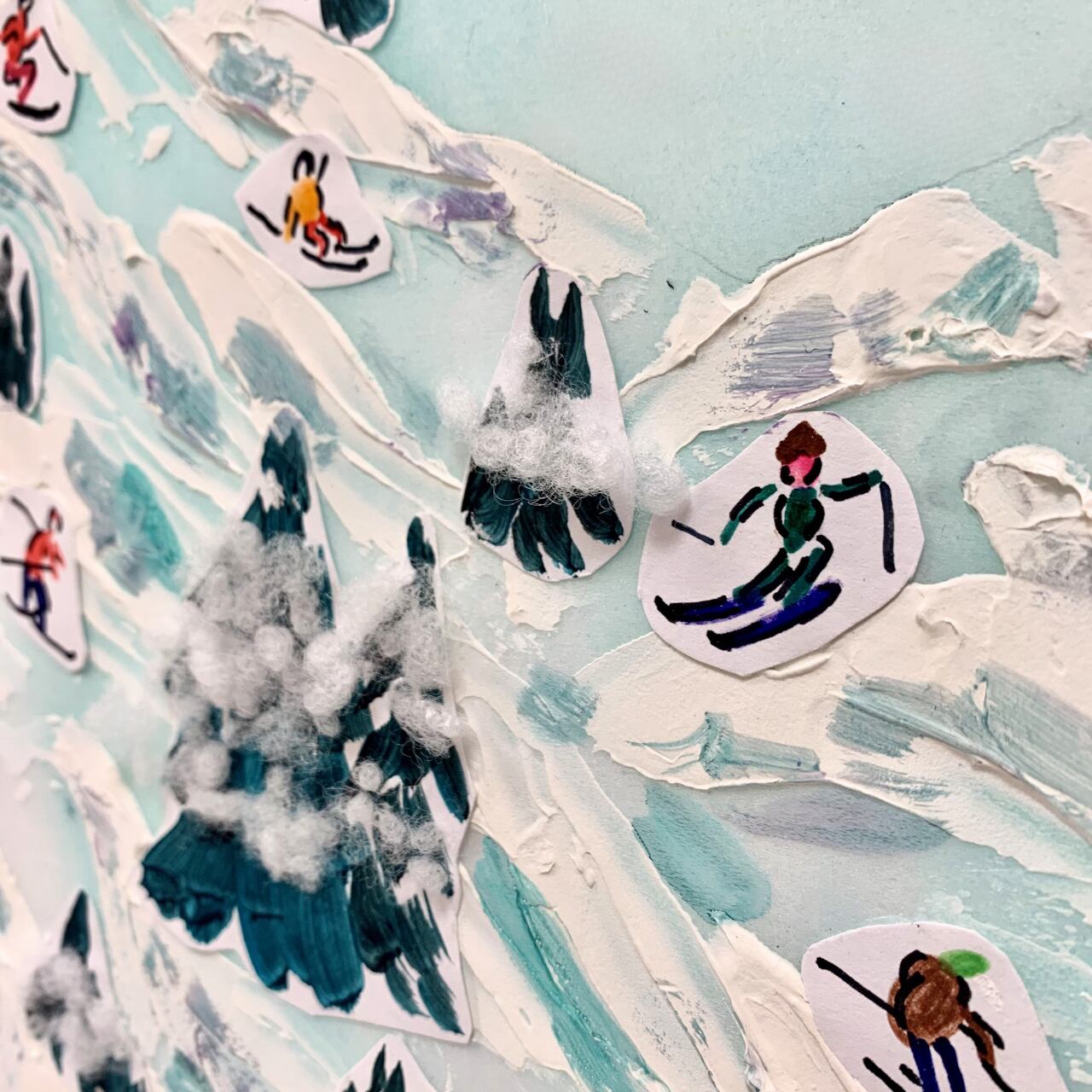 白銀のゲレンデが広がるスキー場の風景を描いた、半立体作品です。雪の部分にはホイップ粘土を使用しており、絵画でありながらも雪の質感を立体表現しているのが最大の特徴。柔らかいタッチと触れたくなるような雪のふわふわとした質感が魅力の一点物です。