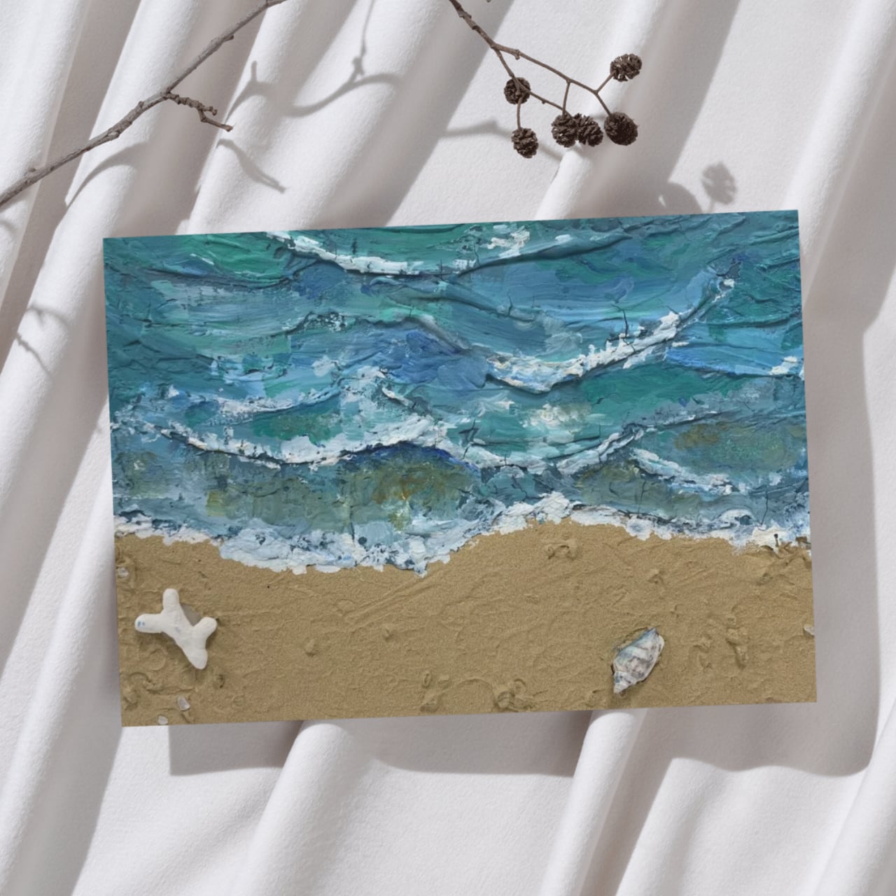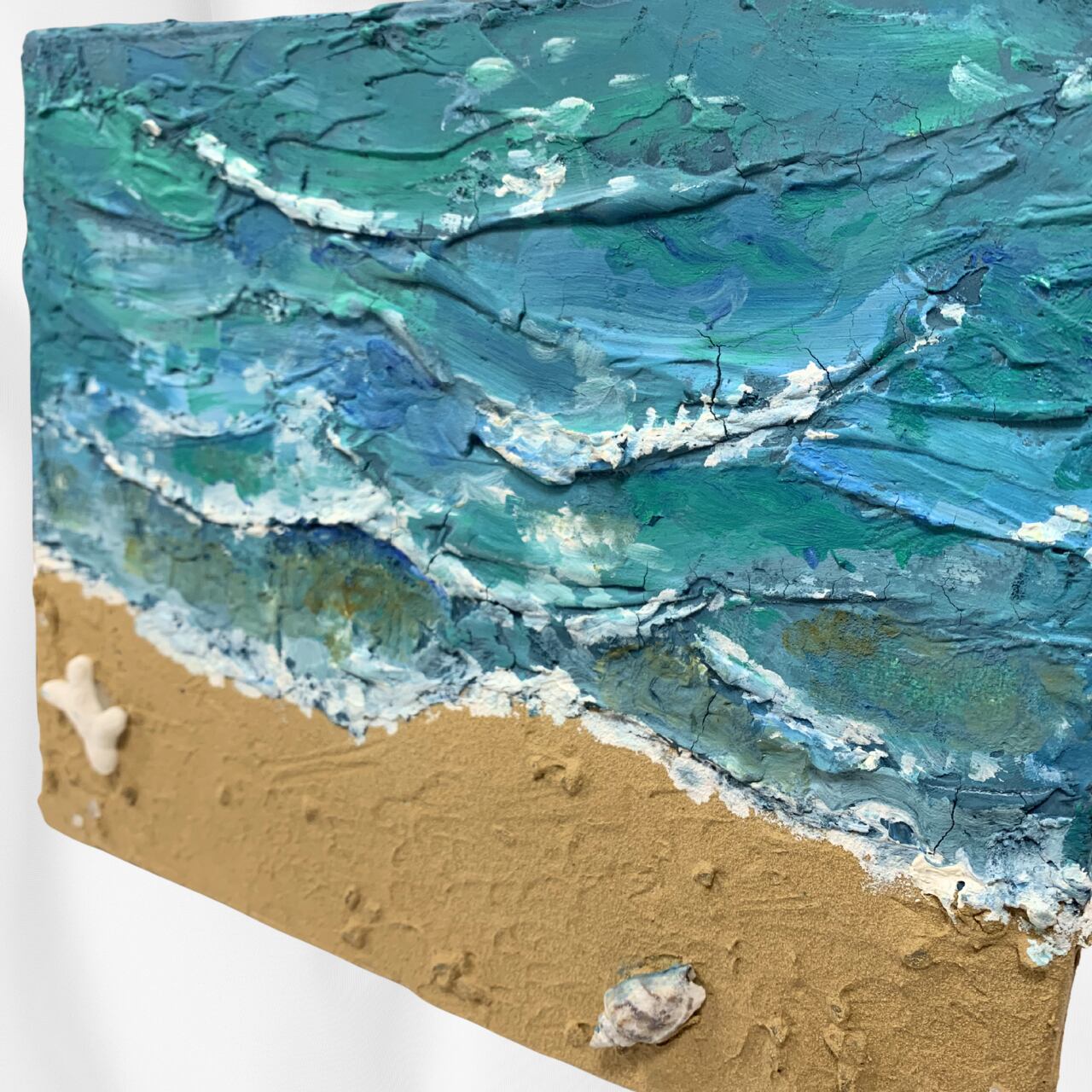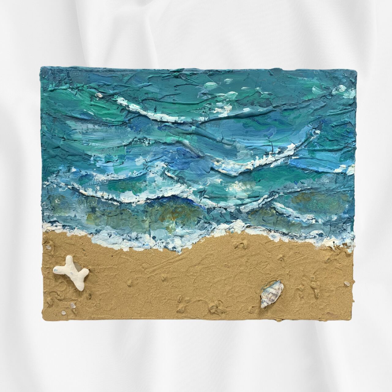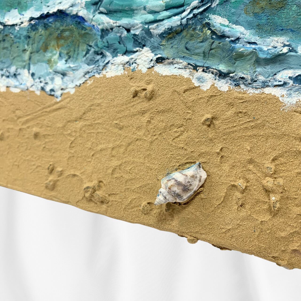 海と砂浜の風景を描いた油絵作品です。砂浜の部分にはパミス(軽石の粉末)を油絵の具に混ぜて使用しており、本物の砂浜のようなざらりとしたリアルな質感を立体的に表現しているのが最大の特徴です。キャンバスの上に実際の砂浜が広がるような臨場感と、油絵ならではの深みのある色彩と艶が、海の美しさを力強く表現した一点物です。